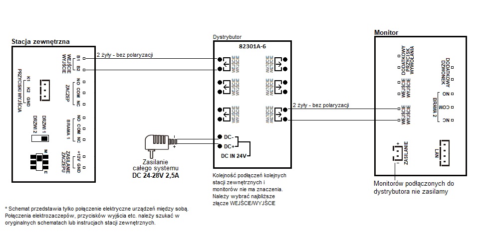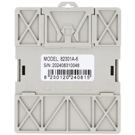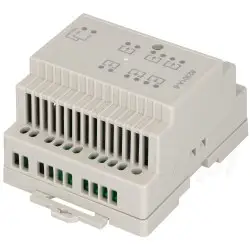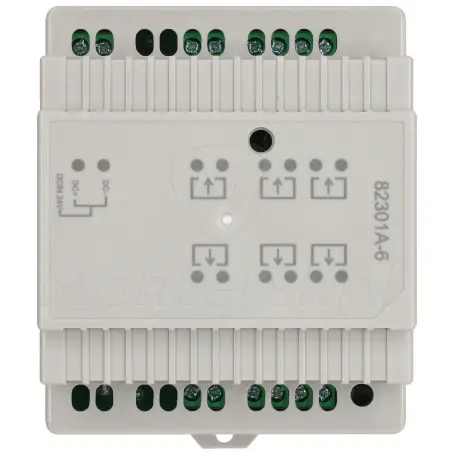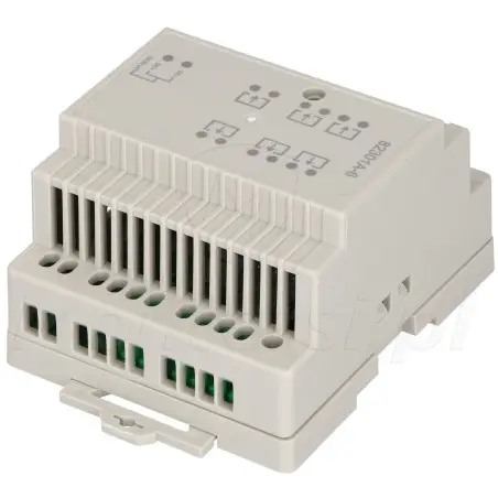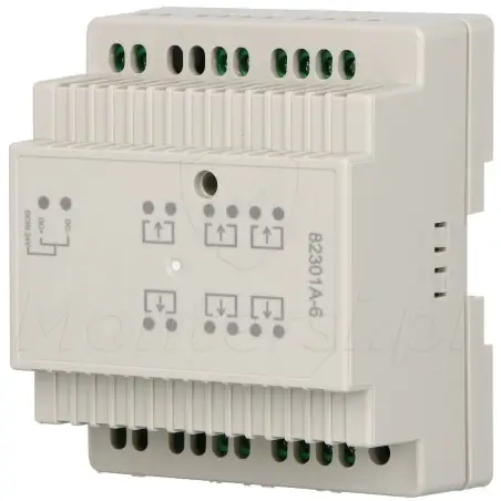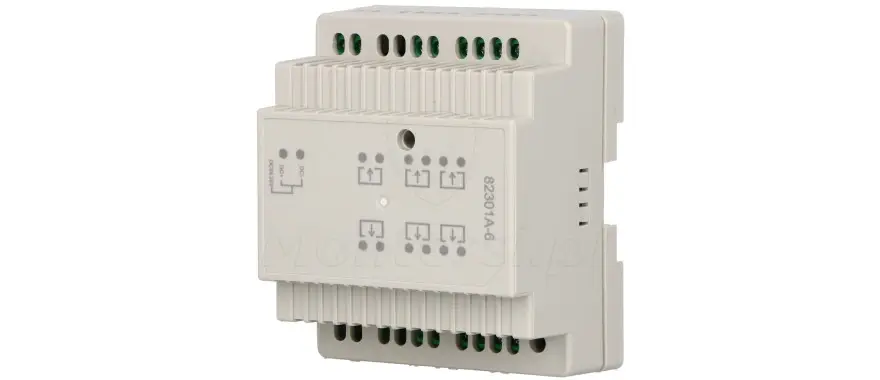82301A-6-FHD - Dystrybutor dla systemu 2-żyłowego TWIN przystosowany do montażu na szynę DIN. Urządzenie ma zastosowanie gdy obecna instalacja wykonana jest w gwiazdę a podłączamy więcej niż jeden monitor lub stację bramową. Urządzenie należy zasilić z zewnętrznego zasilacza napięciem stałym o wartości 24 - 28 V. Do cech charakterystycznych dystrybutora można zaliczyć: