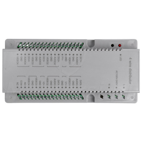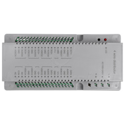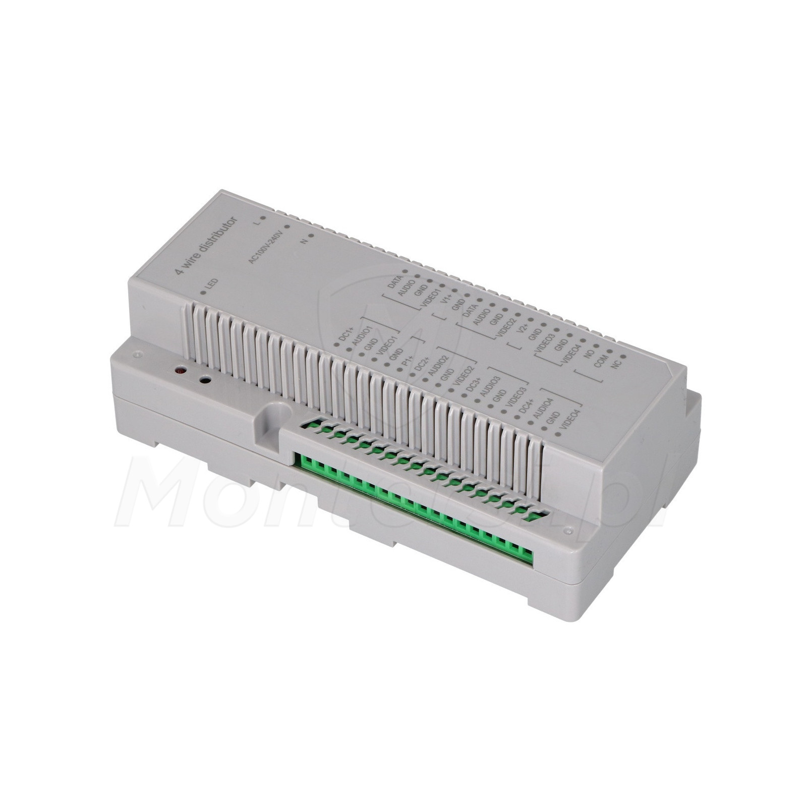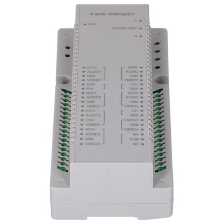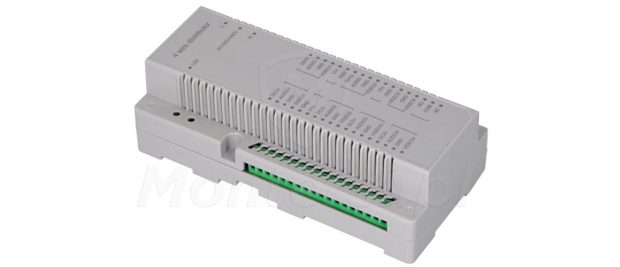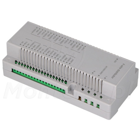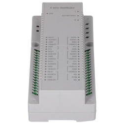 84300 - Dystrybutor dla systemu 4-żyłowego przystosowany do montażu na szynę DIN. Urządzenie ma zastosowanie gdy obecna instalacja wykonana jest w gwiazdę i podłączamy więcej niż jeden monitor lub stację bramową. Urządzenie może być zasilone z sieci 230 V. Do cech charakterystycznych dystrybutora można zaliczyć: