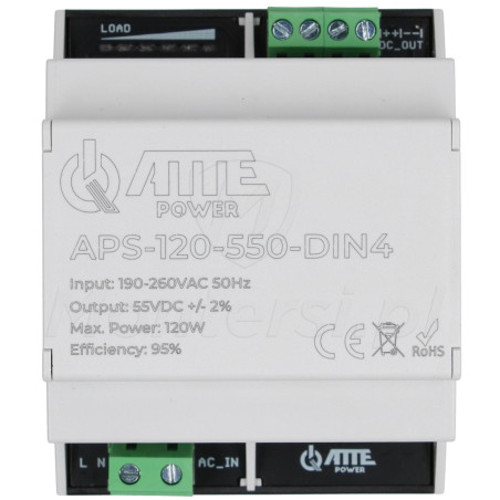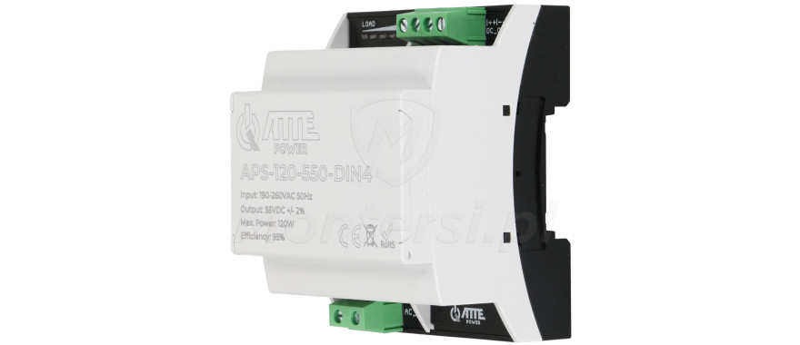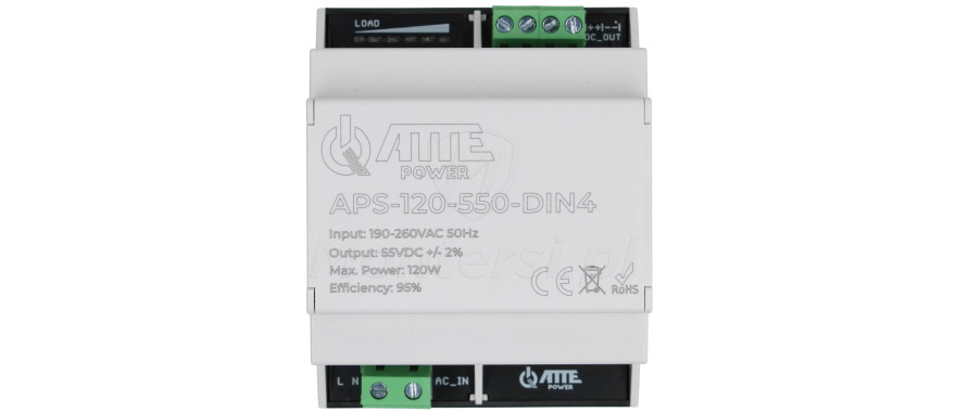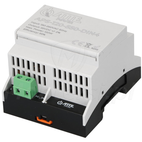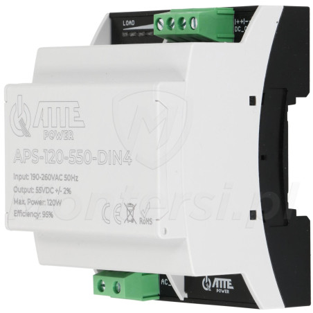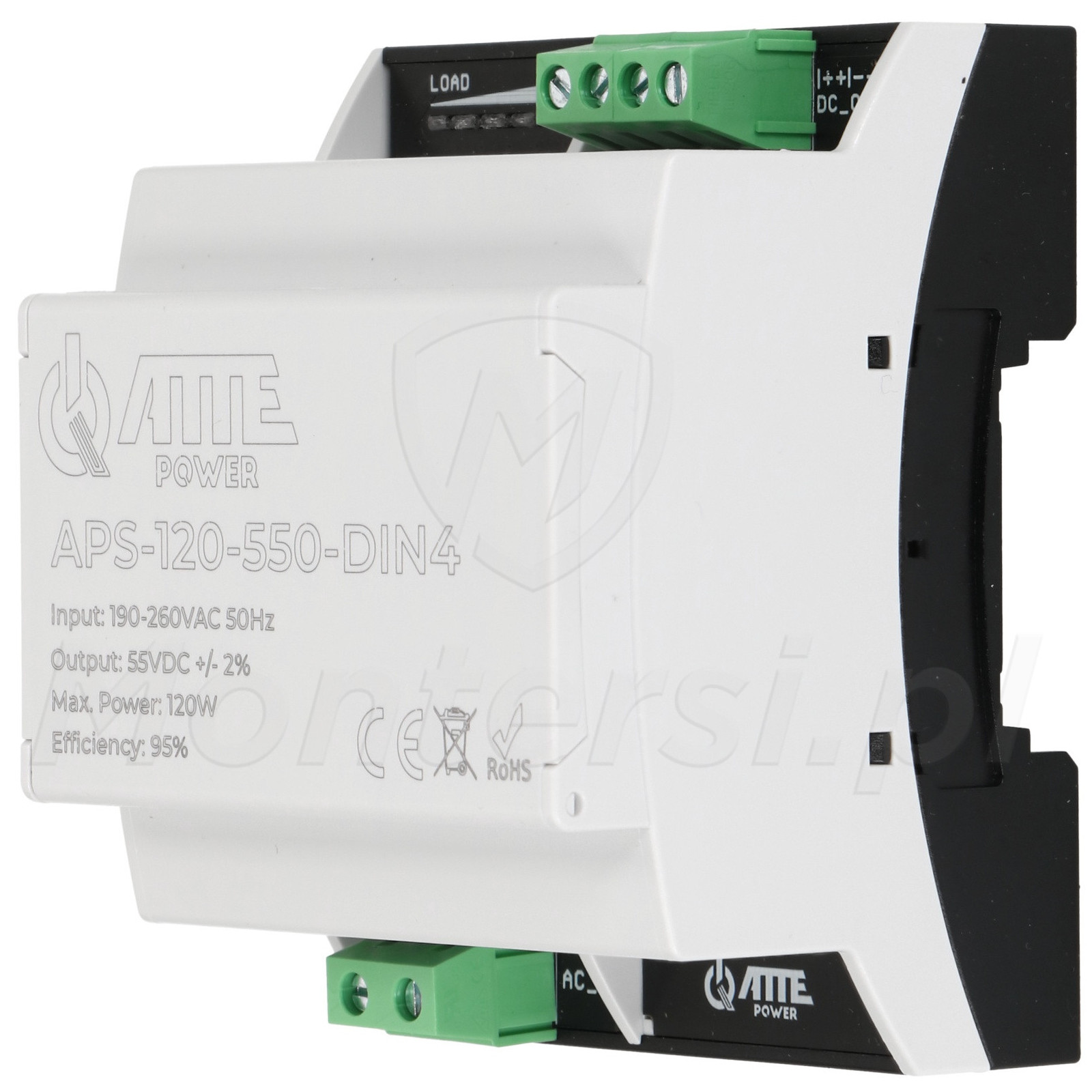 Zasilacz impulsowy 55V DC, przeznaczony do pracy w systemach monitoringu. Zasilacz został wyposażony w liczne zabezpieczenia i cechuje się bardzo dobrymi parametrami pracy - APS-120-550-DIN4 może zasilać jednocześnie urządzenia elektryczne, o łącznym poborze prądu maksymalnie 2,2 A. do najważniejszych cech należy: