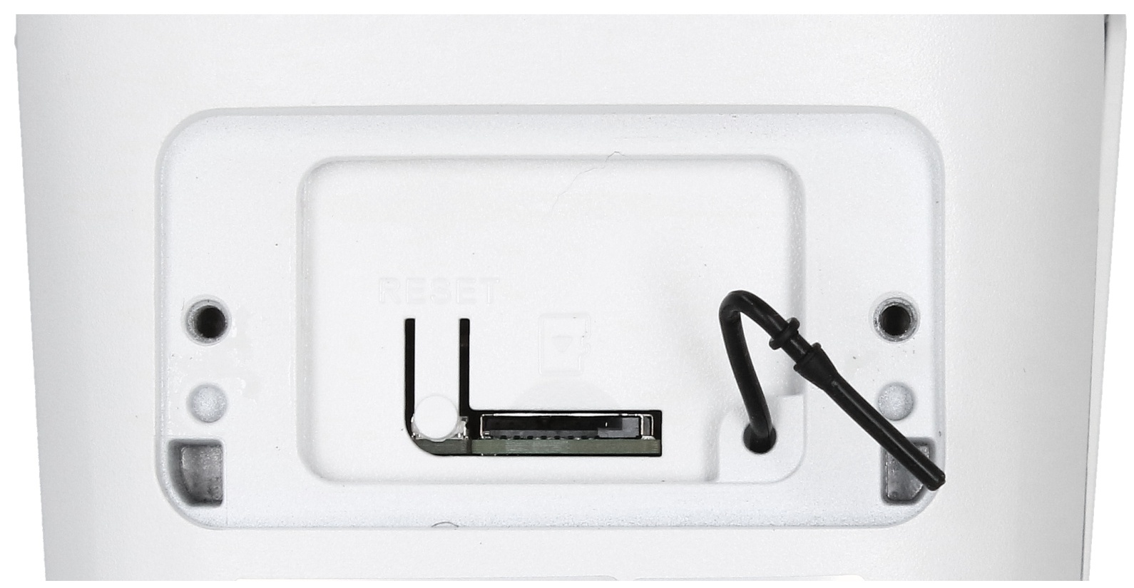 Wbudowana kieszeń na kartę microSD - do 512 GBLokalna archiwizacja nagrańKamera posiada wbudowany slot microSD, umożliwiający lokalne przechowywanie nagrań do 512 GB. Dzięki temu może działać autonomicznie – bez rejestratora. Slot znajduje się pod zabezpieczoną pokrywą i jest łatwo dostępny od spodu obudowy. Obok umieszczono przycisk resetowania ustawień. |