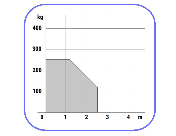 Charakterystyka napędu AY/255/LZależność pomiędzy masą bramy a długością skrzydłaNapęd AY/255/L przeznaczony jest do obsługi bram o masie do 250 kg, zgodnie z wartościami przedstawionymi na wykresie. Zależność ta jest przedstawiona na wykresie, gdzie widać stopniowy spadek dopuszczalnego obciążenia w miarę zwiększania długości ramienia. |
