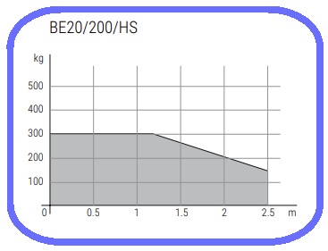 Charakterystyka napędu BE20/200/HSZależność pomiędzy masą bramy a długością skrzydłaNapęd BE20/200/HS przeznaczony jest do obsługi bram o masie do 300 kg, zgodnie z wartościami przedstawionymi na wykresie.Naturalnym zjawiskiem jest, że wraz ze wzrostem długości skrzydła bramy, dopuszczalna masa bramy ulega zmniejszeniu. Oznacza to, że przy maksymalnej długości skrzydła napęd może obsługiwać lżejszą bramę, natomiast pełną masę 300 kg można zastosować jedynie przy krótszym skrzydle. Zależność ta jest przedstawiona na wykresie, gdzie widać stopniowy spadek dopuszczalnego obciążenia w miarę zwiększania długości ramienia. |