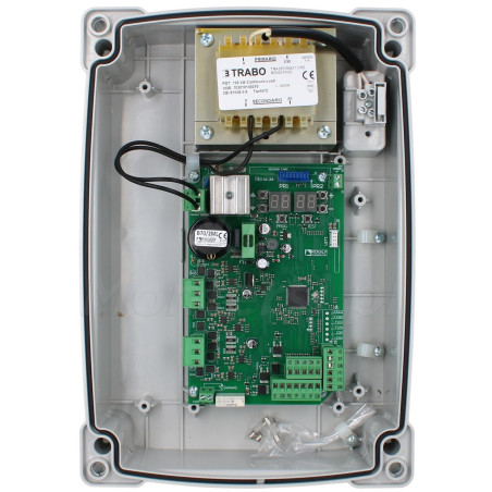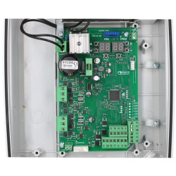 Centrala B70/2ML/BOXZaawansowane sterowanie siłownikami BRUSHLESSZestaw został wyposażony w centralę sterującą B70/2ML/BOX, zaprojektowaną do obsługi silników bezszczotkowych 24 V DC. Urządzenie odpowiada za pełne zarządzanie ruchem bramy, kontrolę zabezpieczeń oraz współpracę z akcesoriami dodatkowymi. Centrala posiada zestaw wejść umożliwiających podłączenie m.in. fotokomórek, listew bezpieczeństwa, przycisków sterujących oraz systemów zdalnego sterowania. Wyposażona jest również w wyjścia do sterowania siłownikami, lampą ostrzegawczą, oświetleniem dodatkowym oraz sygnalizacją stanu bramy. Dzięki temu instalacja może być łatwo dopasowana do indywidualnych potrzeb użytkownika.
