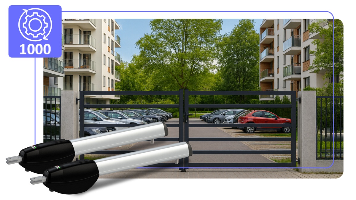 Intensywność pracy siłownikaNiezawodność przy dużym natężeniu ruchuSiłowniki zostały zaprojektowane z myślą o pracy bardzo intensywnej - do 1000 cykli dziennie. Dzięki zastosowaniu silników bezszczotkowych BRUSHLESS oraz cyfrowego systemu sterowania, napędy utrzymują stabilność działania i wysoką precyzję pracy nawet przy częstym użytkowaniu. Konstrukcja oparta wyłącznie na metalowych elementach przekładni minimalizuje ryzyko przedwczesnego zużycia. Tak wysoka intensywność sprawia, że zestaw doskonale sprawdza się w miejscach o dużym natężeniu ruchu, takich jak osiedla mieszkaniowe, wjazdy firmowe, parkingi czy obiekty komercyjne wymagające niezawodnej automatyki bramowej. |