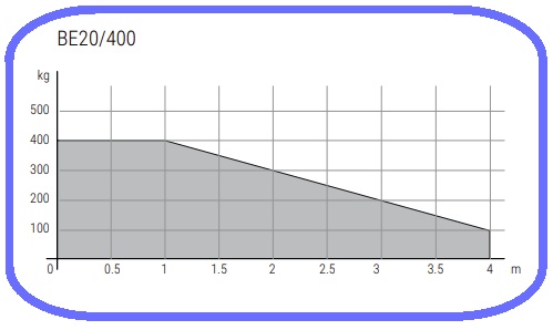 Charakterystyka napędu BE20/400Zależność pomiędzy masą bramy a długością skrzydłaNapęd BE20/400 przeznaczony jest do obsługi bram o masie do 400 kg, zgodnie z wartościami przedstawionymi na wykresie. Zależność ta jest przedstawiona na wykresie, gdzie widać stopniowy spadek dopuszczalnego obciążenia w miarę zwiększania długości ramienia. |