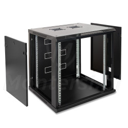 Wisząca szafa PIXIR do standardu RACK 19" przeznaczona do uporządkowania okablowania i rozmieszczenia sprzętów elektronicznych w serwerowni oraz systemów telewizji przemysłowej CCTV. Umożliwia przechowywanie wszystkich istotnym elementów w jednym miejscu, a także łatwy i szybki dostęp do poszczególnych urządzeń zamontowanych wewnątrz szafy. Wyposażona w drzwi frontowe wykonane ze szkła, daję możliwość zajrzenia do środka i sprawdzenia stanu urządzeń bez konieczności otwierania drzwiczek. Na bokach znajdują się drzwiczki wyposażone w systemy zatrzaskowe. Które dają możliwość szerszego dostępu do wnętrza szafy po ich demontażu. System wpuszczenia przewodów, został dobrze przemyślany. Poprzez umieszczone na korpusie szafy panele zaślepiające, po wyłamaniu ich, możemy wpuścić przewody do wnętrza, zachowując przy tym estetykę instalacji.