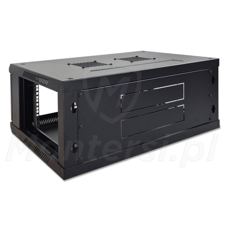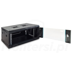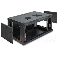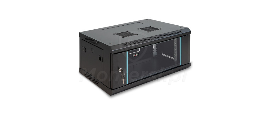Wisząca szafa PIXIR do standardu RACK 19" przeznaczona do uporządkowania okablowania i rozmieszczenia sprzętów elektronicznych w serwerowni oraz systemów telewizji przemysłowej CCTV. Umożliwia przechowywanie wszystkich istotnym elementów w jednym miejscu, a także łatwy i szybki dostęp do poszczególnych urządzeń zamontowanych wewnątrz szafy. Wyposażona w drzwi frontowe wykonane ze szkła, daje możliwość zajrzenia do środka i sprawdzenia stanu urządzeń bez konieczności otwierania drzwiczek. Na bokach znajdują się drzwiczki wyposażone w systemy zatrzaskowe, które dają możliwość szerszego dostępu do wnętrza szafy po ich demontażu. System wpuszczenia przewodów został dobrze przemyślany. Poprzez umieszczone na korpusie szafy panele zaślepiające, po wyłamaniu ich, możemy wpuścić przewody do wnętrza, zachowując przy tym estetykę instalacji.