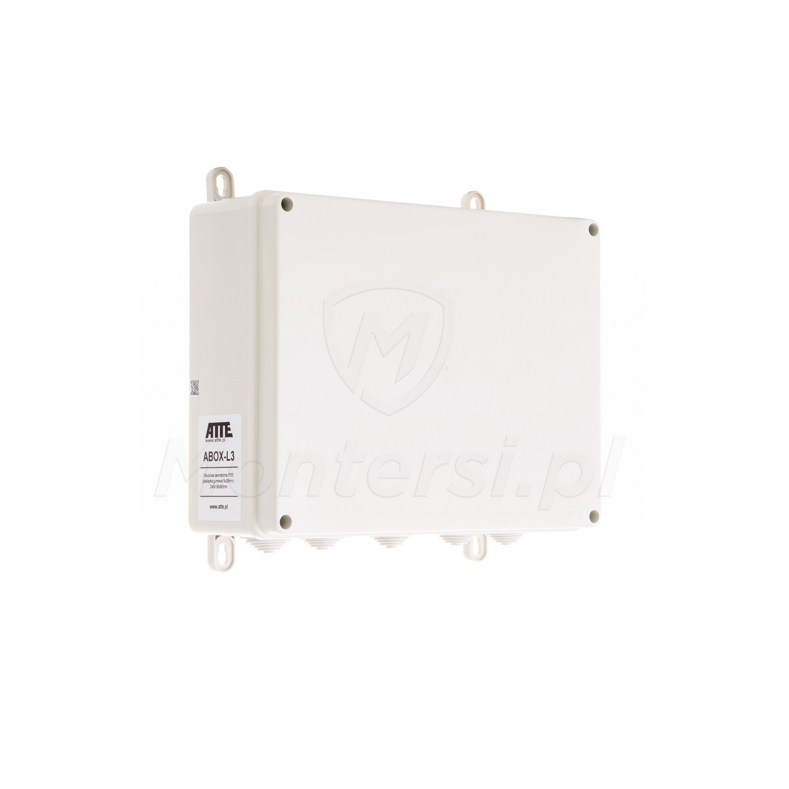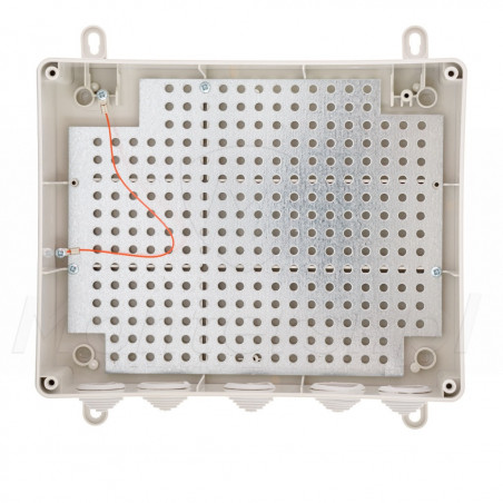 ABOX‑L3 - Zewnętrzna obudowa montażowa wyposażona w blachę montażową posiadającą otworowanie w rastrze 10.8 mm. Wykonanie z bezhalogenowego materiału, odpornego na promienie UV pozwala na montaż obudowy na zewnątrz budynku bez ryzyka utraty koloru. Jako główne cechy charakterystyczne obudowy można zaliczyć: