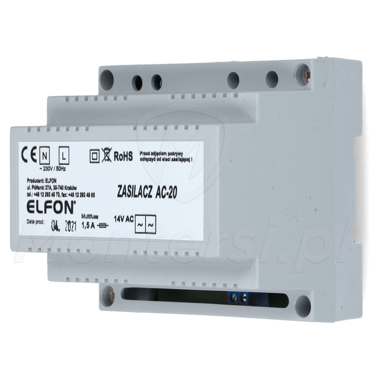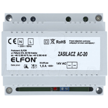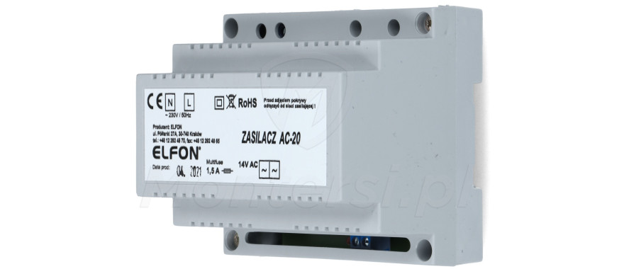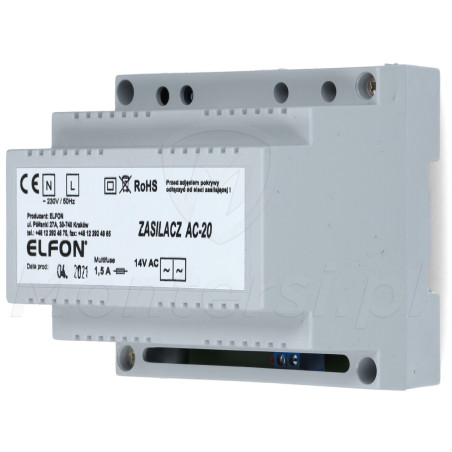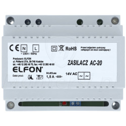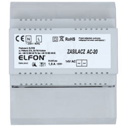 AC-20 - Zasilacz domofonowy 14V AC (1.5 A) dedykowany do systemu cyfrowego Elfon OPTIMA. Jego cechami charakterystycznymi są: