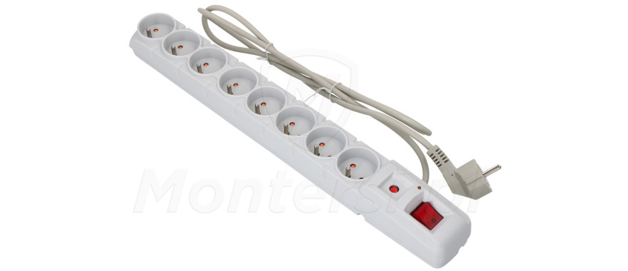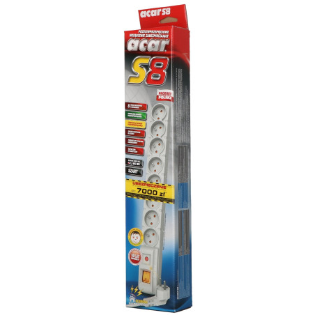 ACAR S8 - Standardowa listwa przepięciowa 230V AC, wyposażona w 8 gniazd z uziemieniem. Dedykowana do stosowania w domu lub biurze, może zasilić urządzenia o łącznym poborze mocy do 2300 W. Cechami charakterystycznymi listwy są: