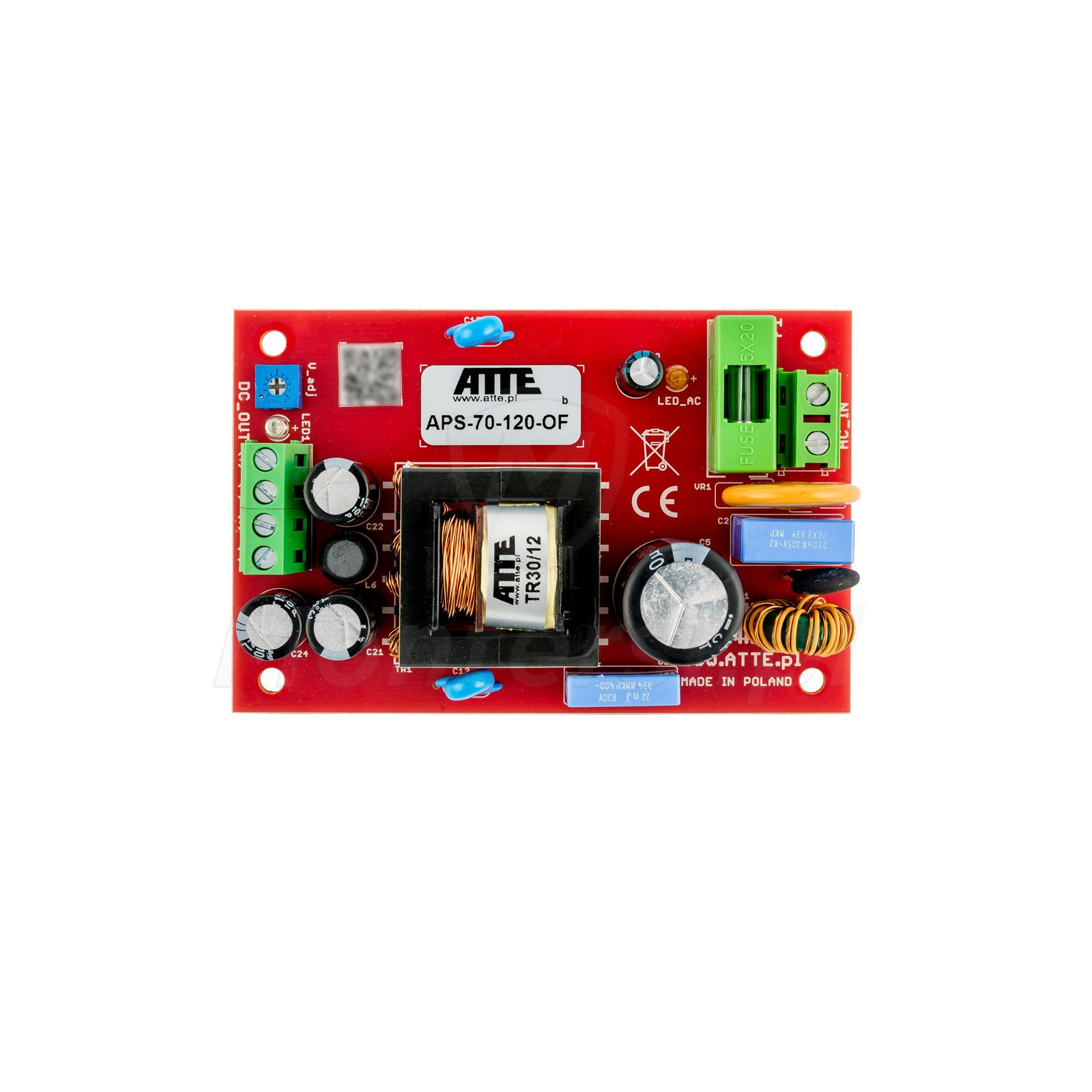 APS‑70‑120‑OF - Moduł zasilacza sieciowego przeznaczony do zabudowy. Zasilacz przeznaczony do zasilania urządzeń wymagających stabilnego napięcia takich jak kamery CCTV czy rejestratory. Charakteryzuje się stabilnym napięciem 12 V DC i może zasilać urządzenia o mocy do 72 W. Do najbardziej charakterystycznych cech zasilacza zaliczyć można:
