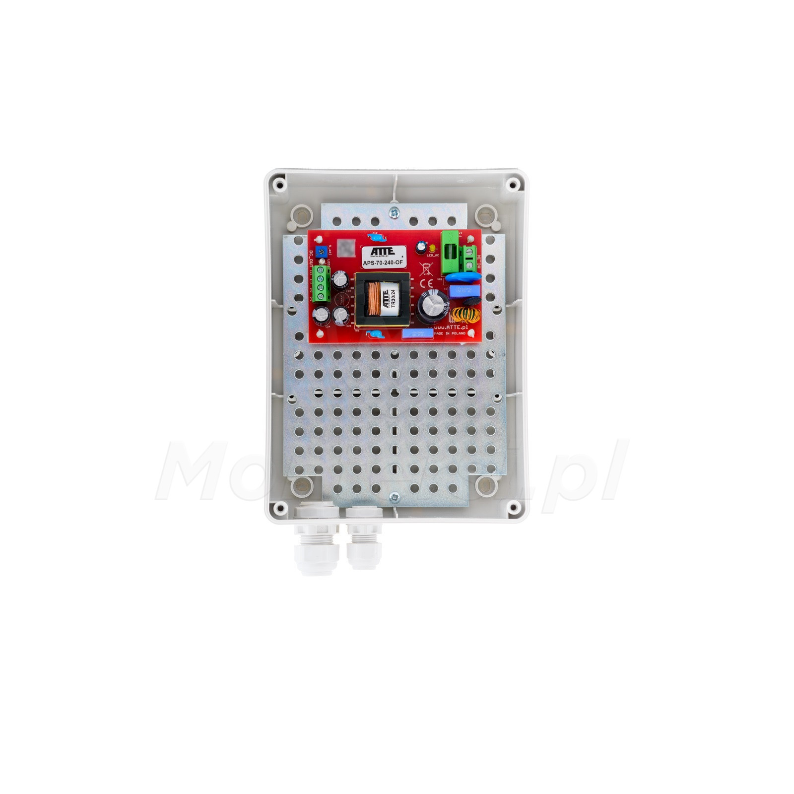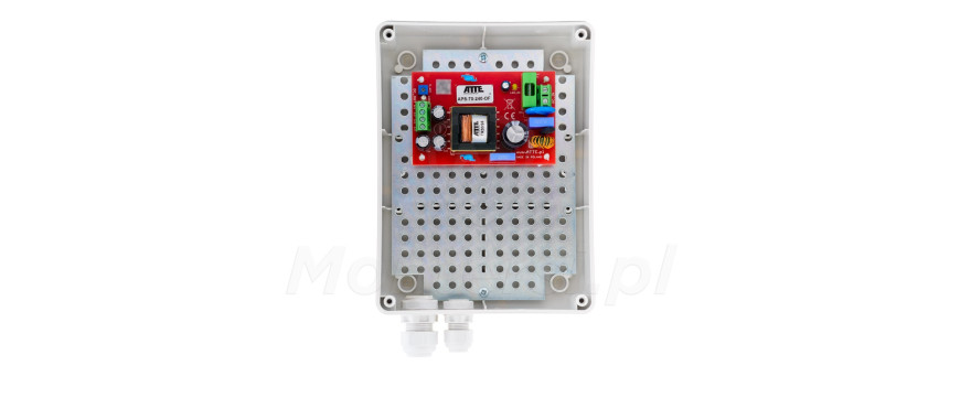 APS‑70‑240‑M1 - Moduł zasilacza sieciowego umieszczony w obudowie wewnętrznej ABOX-M1. Zasilacz przeznaczony do zasilania urządzeń wymagających stabilnego napięcia takich jak kamery CCTV czy rejestratory. Charakteryzuje się stabilnym napięciem 24 V DC i może zasilać urządzenia o mocy do 72 W. Do najbardziej charakterystycznych cech zasilacza zaliczyć można: