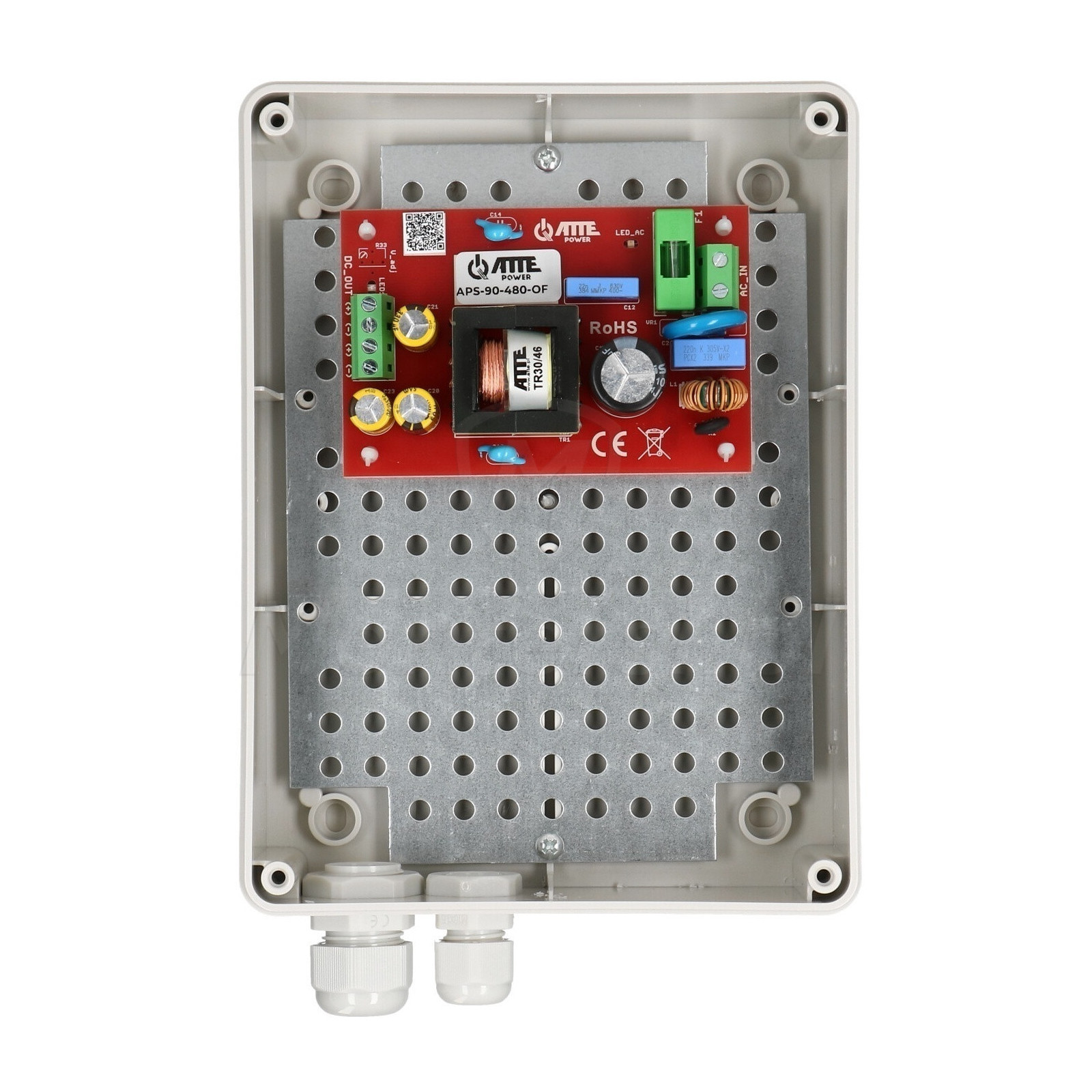 APS‑90‑480 dokonuje zamiany napięcia wejściowego 180 - 240 V AC do odpowiedniego napięcia wyjściowego, które może być regulowane w zakresie 21 - 26 V DC. Zastosowanie obudowy zewnętrznej z normą IP56 pozwala na montaż urządzenia w miejscach narażonych na kurz czy deszcz.