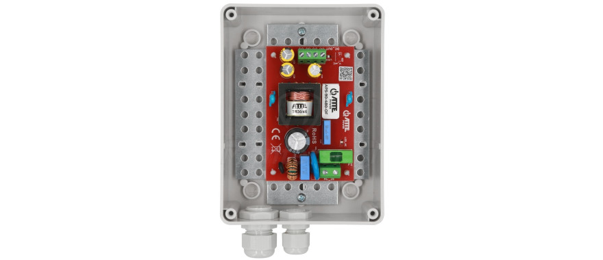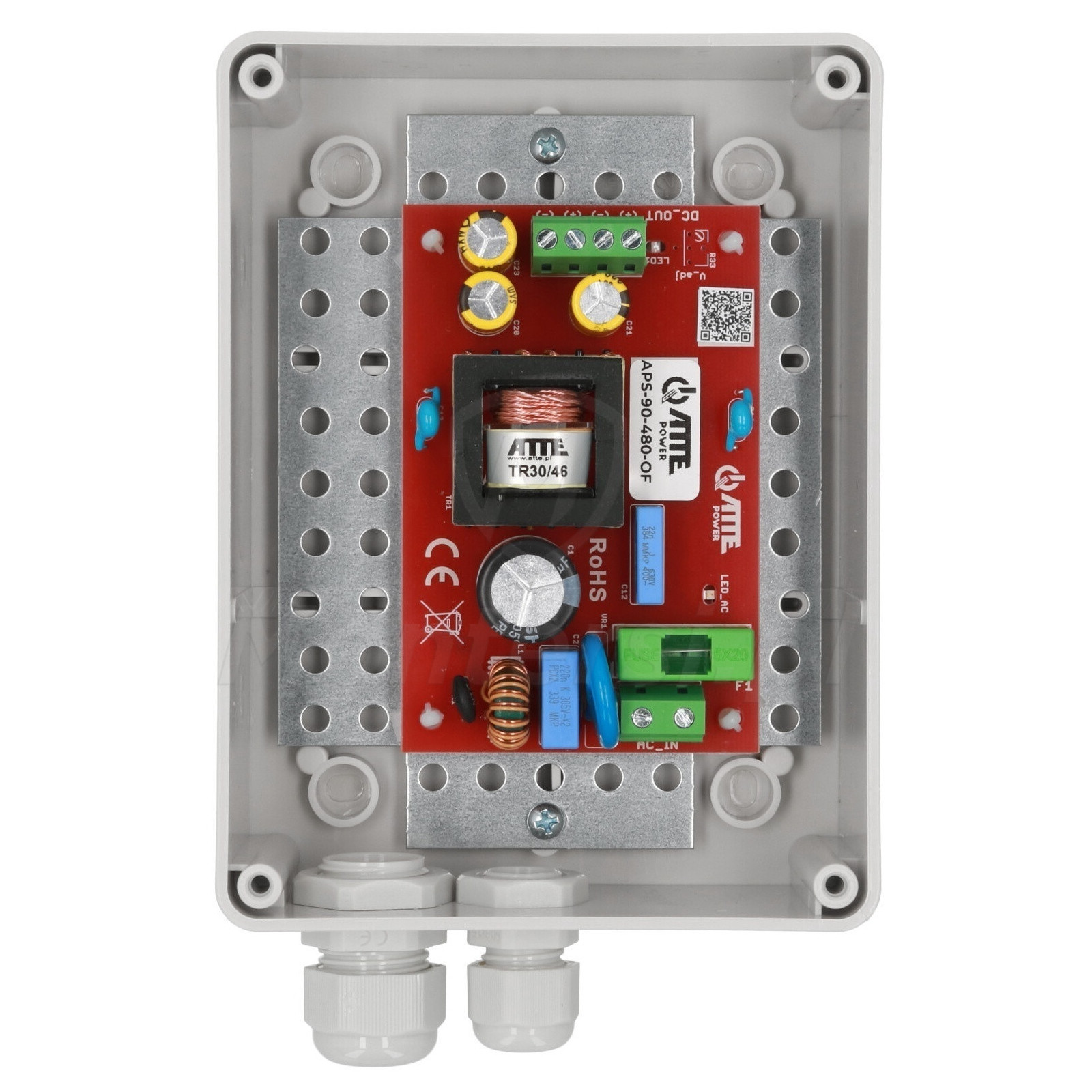 APS‑90‑480 dokonuje zamiany napięcia wejściowego 180 - 240 V AC do odpowiedniego napięcia wyjściowego, które może być regulowane w zakresie 21 - 26 V DC. Zastosowanie obudowy zewnętrznej z normą IP56 pozwala na montaż urządzenia w miejscach narażonych na kurz czy deszcz.