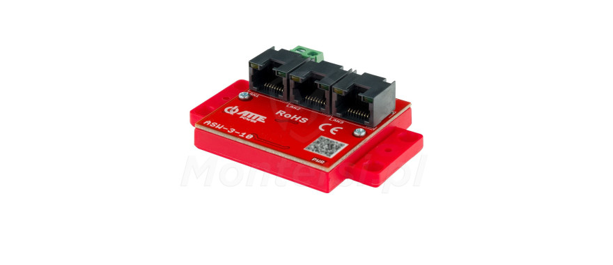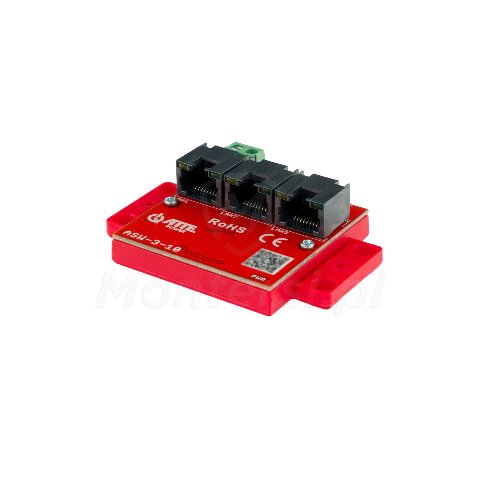 ASW-3-10 to miniaturowy, niezarządzalny 3-portowy przełącznik sieciowy LAN o przepustowości 10/100 Mbps, zaprojektowany do rozszerzania sieci na odległości większe niż 100 metrów. Zasilany wyłącznie przez złącze śrubowe (10–56 V DC), cechuje się bardzo niskim poborem mocy (<1 W) i zabezpieczeniem przepięciowym na wszystkich portach. Kompaktowa konstrukcja umożliwia montaż w trudno dostępnych miejscach, w tym na szynie DIN lub w dedykowanych obudowach serii ABOX.