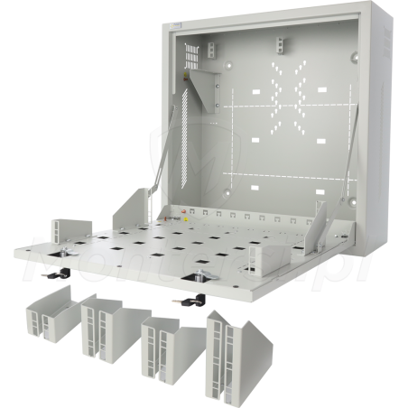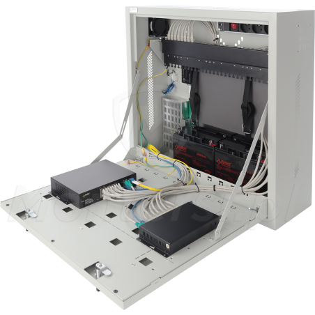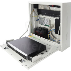 Model AWO534G jest również wyposażony w uchwyty RACK (1 szt. 1U, 2szt. 2U, 1szt. 3U), umożliwiający mocowanie switchy PoE, dedykowanych do montażu w szafie standardu RACK 19". We wnętrzu obudowy znajduje się również miejsce do umieszczenia 4 akumulatorów podtrzymujących o pojemności 7 Ah lub dwóch o pojemności 17 Ah.