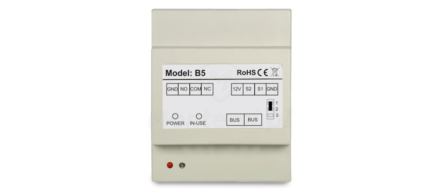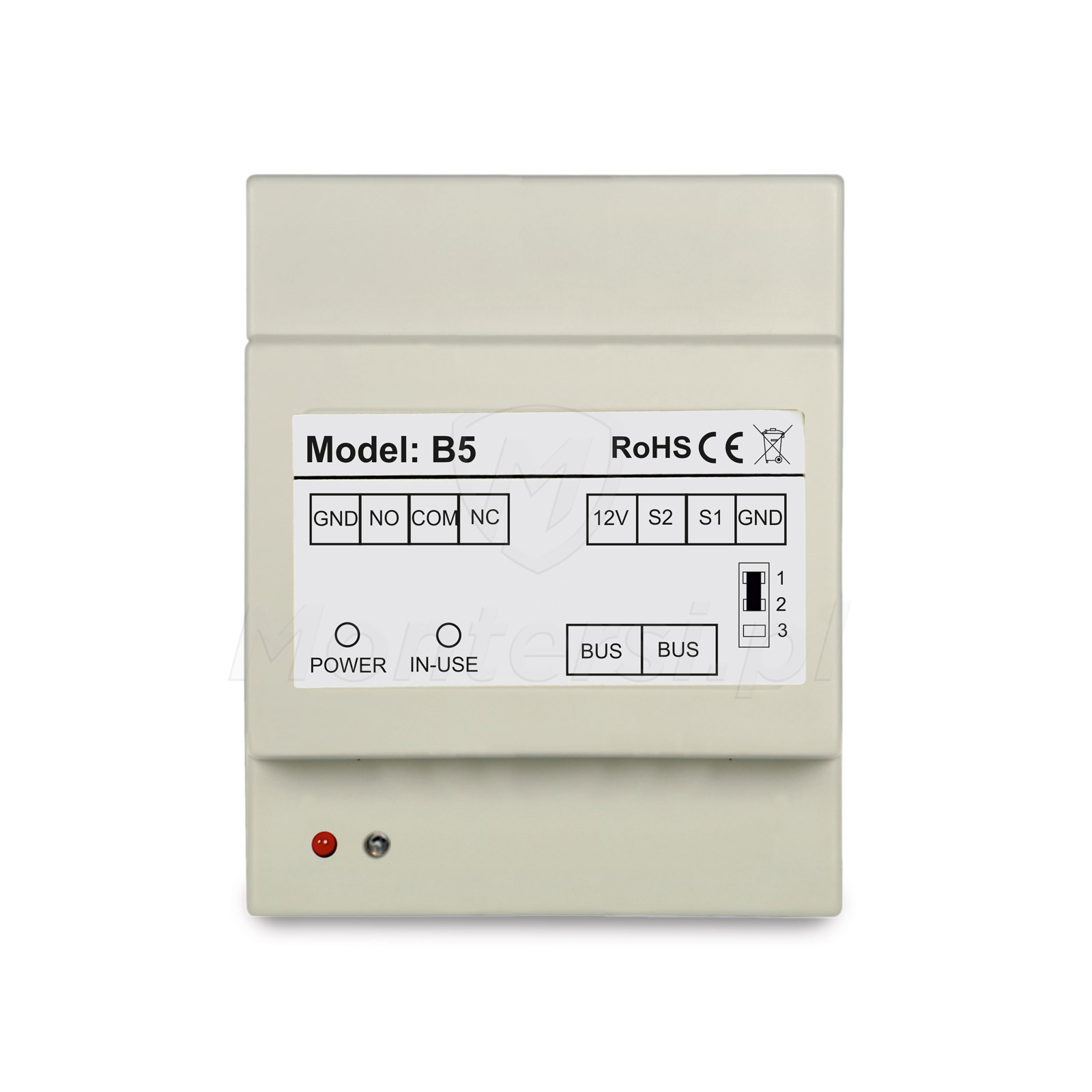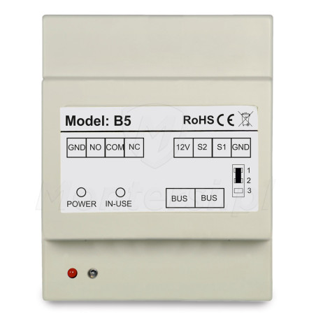 B5 - Moduł sterujący, umożliwiający rozbudowę stacji bramowej systemu wideodomofonu VIDOS DUO o dodatkowe wyjście przekaźnikowe. Przy jego pomocy możliwe jest sterowanie np. dodatkowym elektrozaczepem, automatyczną bramą lub sterownikiem oświetlenia z poziomu panelu bramowego Dodatkowymi zaletami modułu są: