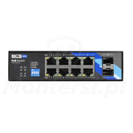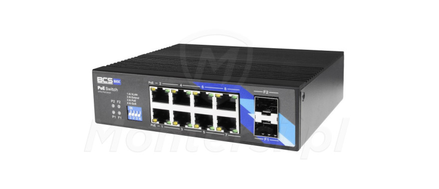 BCS-B-ISP08G-2SFP - 8-portowy switch PoE BCS Basic, dedykowany do pracy w systemie monitoringu IP. Przy jego pomocy możliwe jest zasilenie i transmitowanie danych z 8 kamer IP PoE. Przez co sprawdza się on świetnie w miniaturowych systemach monitoringu, stosowanych w małych magazynach, sklepach lub domach. Oczywiście switch może również pracować jako element większego systemu monitoringu, w ramach którego współpracuje kilka switchy PoE.
