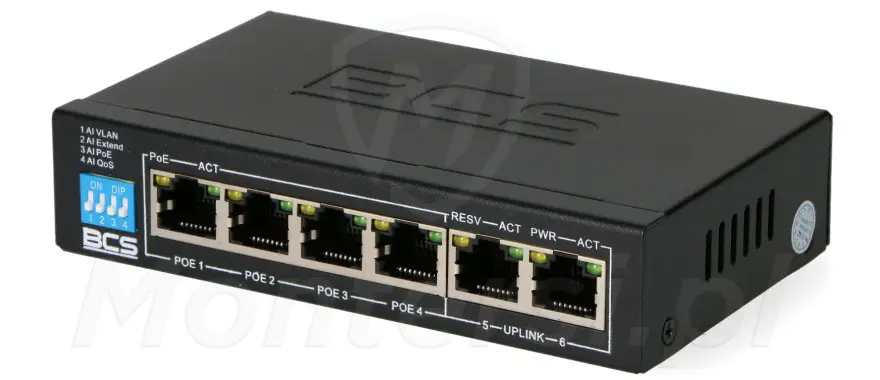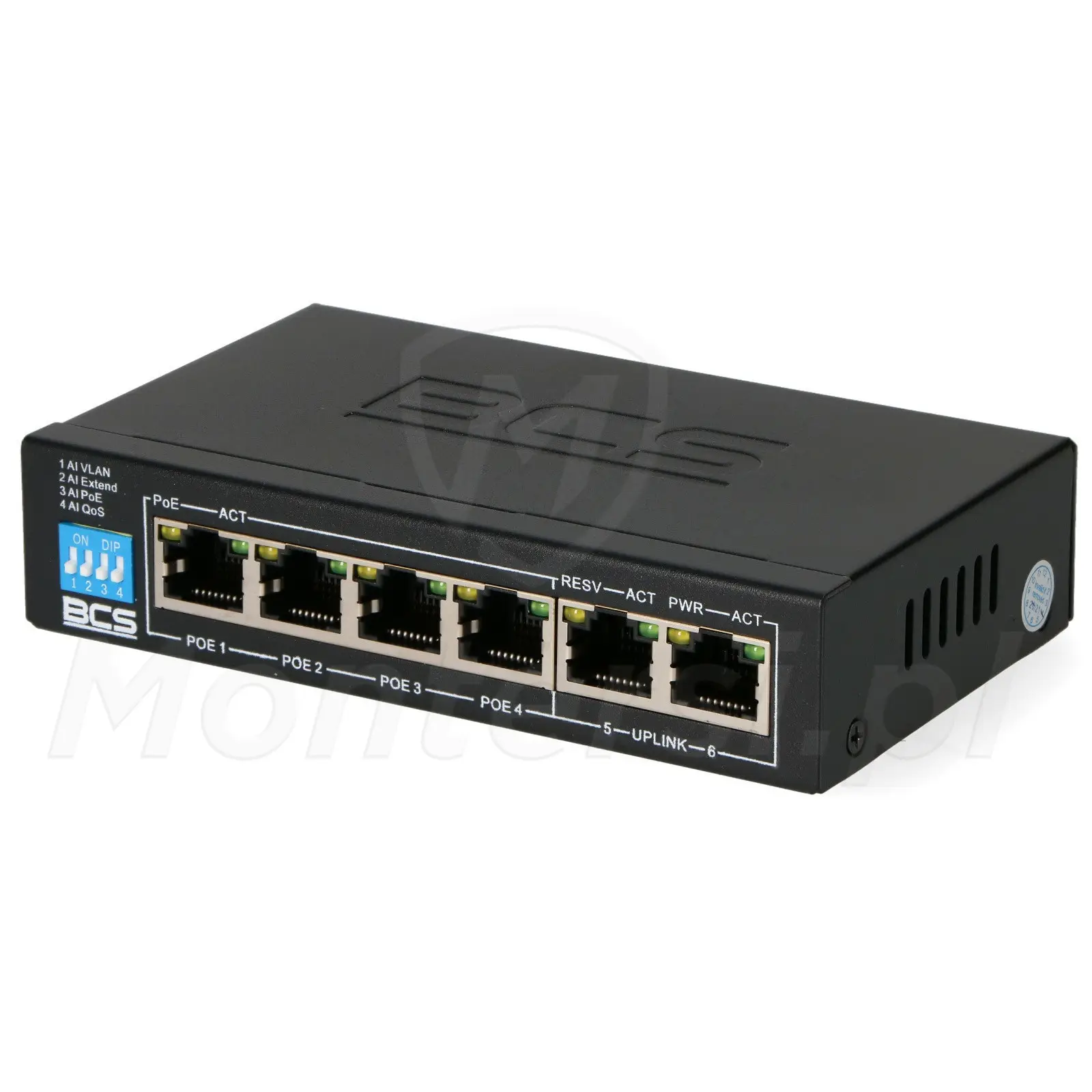 BCS-B-SP0402 - 6-portowy switch PoE, zaprojektowany z myślą o systemach monitoringu IP. Niezawodny i uniwersalny, umożliwia transmisję danych i zasilanie 4 kamer IP PoE.