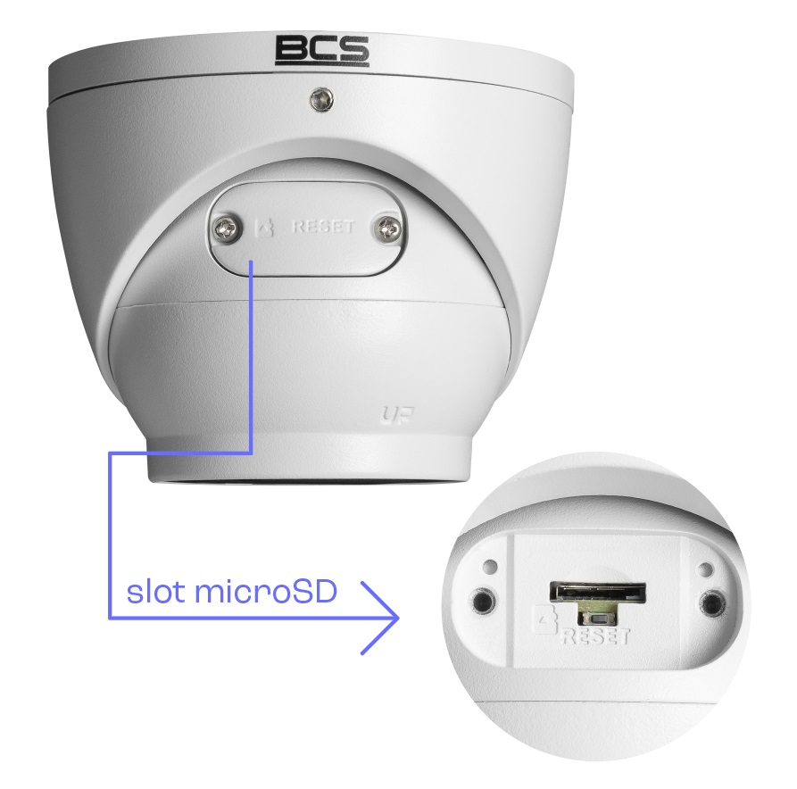 Wbudowana kieszeń na kartę microSD - do 256GBLokalna archiwizacja nagrańKamera posiada wbudowany slot microSD, umożliwiający lokalne przechowywanie nagrań do 256 GB. Dzięki temu może działać autonomicznie – bez rejestratora. Slot znajduje się pod zabezpieczoną pokrywą i jest łatwo dostępny od spodu obudowy. Obok umieszczono przycisk resetowania ustawień. |