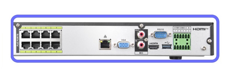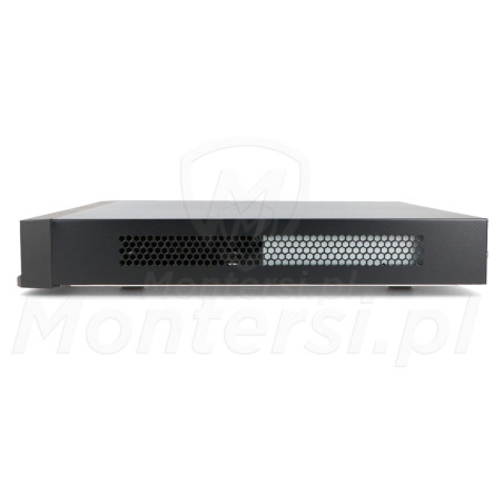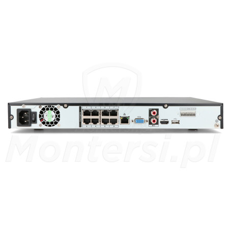 Złącza i interfejsy komunikacyjneSzeroki wybór portów do integracji systemuRejestrator oferuje bogaty zestaw złączy, zapewniających pełną elastyczność w integracji systemu monitoringu. Urządzenie wyposażone jest w 8 portów PoE zgodnych ze standardem IEEE 802.3 af/at, z maksymalną mocą 130 W (do 25,5 W na port). Dzięki temu możliwe jest bezpośrednie zasilanie i transmisja danych do 8 kamer IP bez konieczności stosowania dodatkowych zasilaczy czy okablowania.