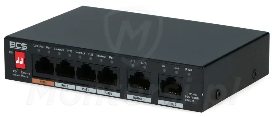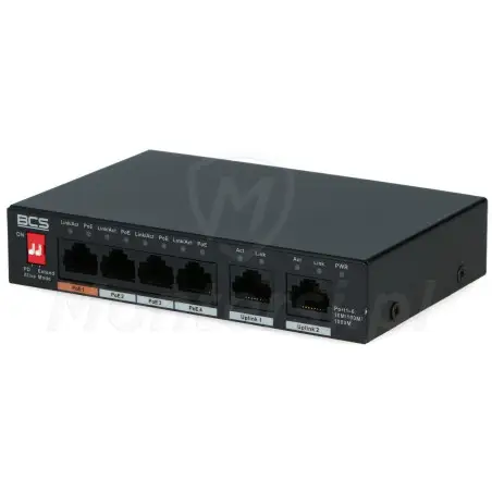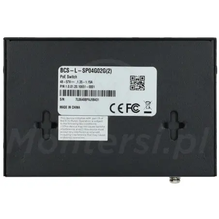BCS-L-SP04G02G(II) - 6-portowy, inteligentny switch PoE, dedykowany do pracy w systemie monitoringu IP. Umożliwia transmisję obrazu i zasilanie do 4 kamer IP PoE. Sprawdza się on świetnie w systemach monitoringu obiektów takich jak domu, sklepy, magazyny lub pomieszczenia biurowe. Może on również pracować jako element większego systemu monitoringu, w którym współpracuje ze sobą kilka switchy.