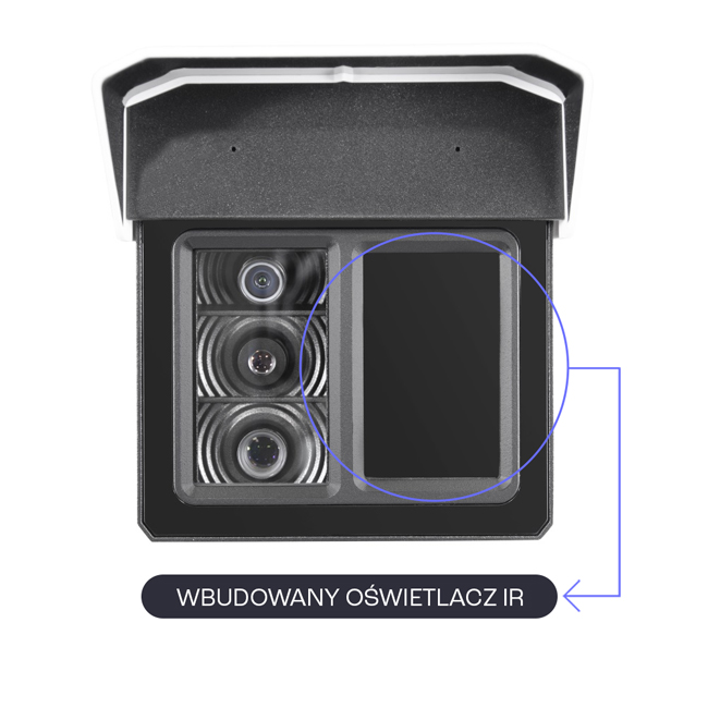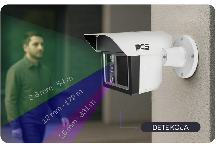 Stałoogniskowe obiektywy 3.6 mm, 12 mm, 25 mmSkuteczna obserwacja szerokiego kadruKamera została wyposażona w trzy niezależne przetworniki z obiektywami o różnych kątach widzenia: 100.4° w poziomie i 85.9° w pionie dla obiektywu 3.6 mm, 29.5° w poziomie, 25.7° w pionie dla 12 mm oraz 14.9° w poziomie, 13° w pionie dla 25 mm Pozwala to na jednoczesne monitorowanie szerokiej i wąskiej strefy. Dzięki temu jedno urządzenie może zastąpić kilka klasycznych kamer, oferując pełny nadzór nad dużym obszarem bez utraty szczegółowości obrazu. |