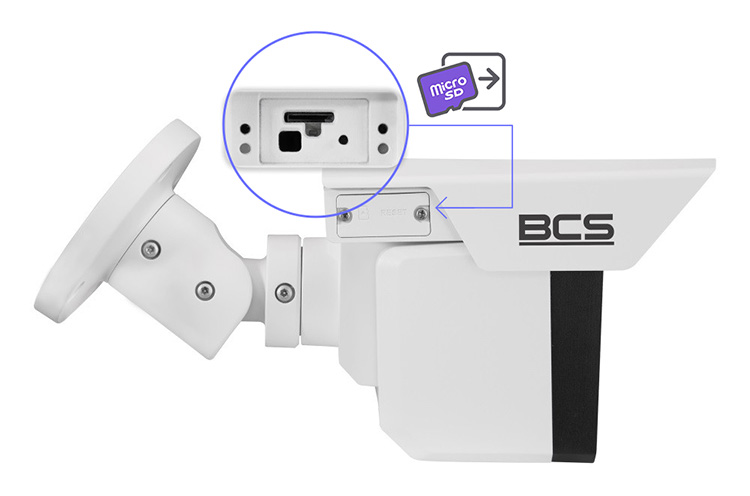 Kieszeń na kartę microSDLokalna archiwizacja nagrańKamera posiada wbudowane gniazdo na kartę microSD, o maksymalnej pojemności 1 TB. Karta służy jako zapasowe miejsce pamięci, które można wykorzystać do tworzenia lokalnych kopii nagrań. Dodatkowo kamera z zastosowaną kartą może pracować w pełni autonomiczne, tworząc miniaturowy system monitoringu. W takim systemie wszystkie nagrania są zapisywane na karcie i jest on obsługiwany z poziomu przeglądarki internetowej.