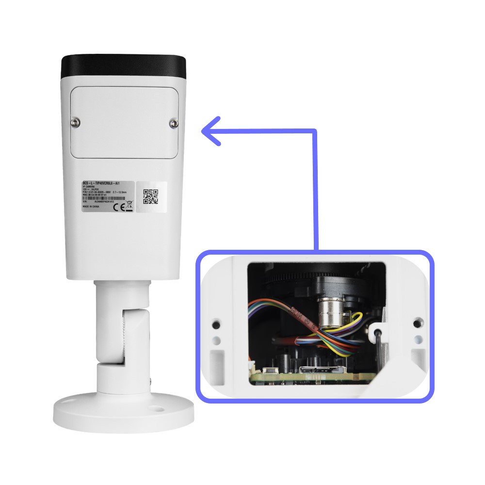 Wbudowana kieszeń na kartę microSD - do 256GbLokalna archiwizacja nagrańKamera posiada wbudowany slot microSD, umożliwiający lokalne przechowywanie nagrań do 256 GB. Dzięki temu może działać autonomicznie – bez rejestratora. Slot znajduje się pod zabezpieczoną pokrywą i jest łatwo dostępny od spodu obudowy. Obok umieszczono przycisk resetowania ustawień. |