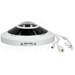 Kamera jest również wyposażona w szerokokątny obiektyw typu fisheye 1.4 mm (F2.0). Zapewnia on szeroki kąt widzenia 180° w poziomie / 180° w pionie, dzięki któremu kamera może prowadzić skuteczną obserwację całego obszaru dookoła siebie. Zamontowana na suficie, na środku pomieszczenia, powinna bez większych problemów prowadzić jego skuteczną obserwację.