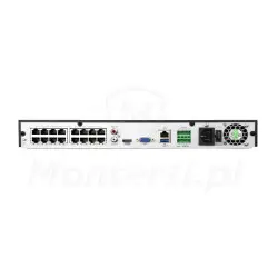 Cechą charakterystyczną modelu jest wbudowany 16-portowy switch PoE 802.3af / 802.3at. Podłączając do niego kamery IP PoE, możliwe jest jednoczesne ich zasilanie i transmisja danych po tym samym kablu UTP. Technologia Power over Ethernet niesie ze sobą wiele zalet, do których można zaliczyć: