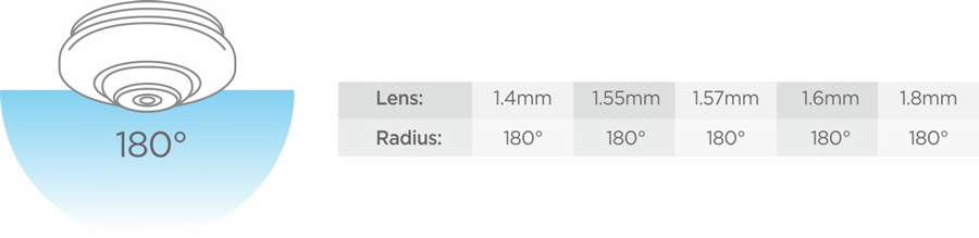 Kamera jest również wyposażona w szerokokątny obiektyw typu fisheye 1.5 mm (F1.8). Zapewnia on szeroki kąt widzenia 180° w poziomie / 180° w pionie, dzięki któremu kamera może prowadzić skuteczną obserwację całego obszaru dookoła siebie. Zamontowana na suficie, na środku pomieszczenia, powinna bez większych problemów prowadzić jego skuteczną obserwację.