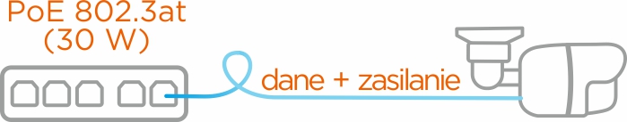 Kamera wspiera technologię Power over Ethernet, która umożliwia transmisję danych i energii elektrycznej po tym samym kablu UTP. Dzięki niej zasilanie kamery można zrealizować bezpośrednio z poziomu switcha PoE+ - przykładowo z poziomu switcha wbudowanego do rejestratora NVR serii "P".