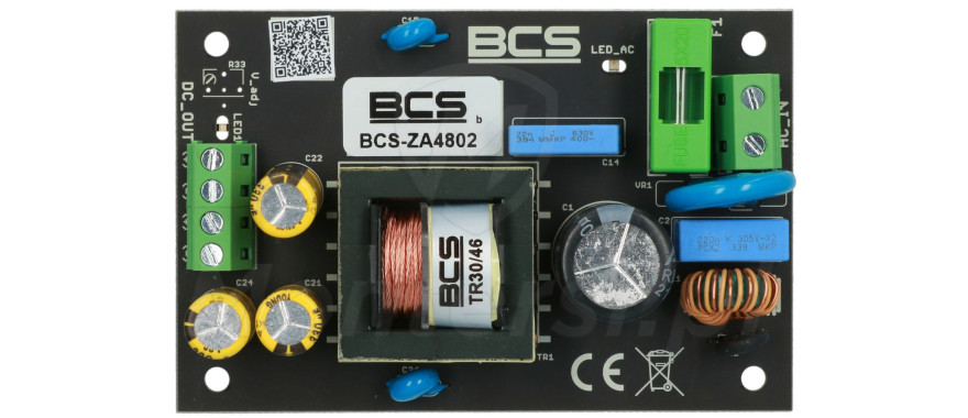 BCS-ZA4802 - Moduł zasilacza impulsowego 48V DC, przeznaczony do zasilania urządzeń o obciążalności 2 A (max. moc ciągła 96 W). Sprawdza się świetnie w systemach monitoringu CCTV, jednak nic nie stoi na przeszkodzie, aby stosować go w innych systemach. Jego dodatkowymi zaletami są: