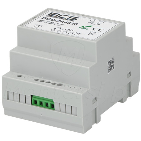 Zasilacz impulsowy 48V DC, przeznaczony do pracy w systemach monitoringu. Zasilacz został wyposażony w liczne zabezpieczenia i cechuje się bardzo dobrymi parametrami pracy - BCS-ZA4820 może zasilać jednocześnie 2 urządzenia elektryczne, o łącznym poborze prądu maksymalnie 2 A.