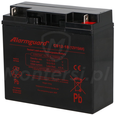 Bezobsługowy akumulator kwasowo - ołowiowy, wykonany w technologii AGM. Przeznaczony do awaryjnego zasilania np. systemów alarmowych, systemów bezpieczeństwa przeciw pożarowego, aparatury pomiarowej, narzędzi elektrycznych. Charakteryzuje się szczelną konstrukcją, zapewniającą bezpieczną eksploatację i projektowym okresem żywotności około 5 lat. Akumulator jest zakończony 2 złączami 14 x 12 x 2 mm.