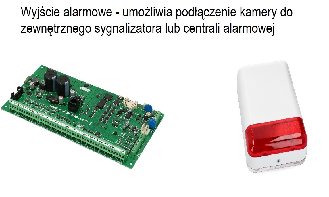 Dodatkową zaletą kamery są wbudowane 1 wejście i 1 wyjście alarmowe. Służą one do integracji z urządzeniami systemu alarmowego, kontroli dostępu lub automatyki domowej, umożliwiając realizację zaawansowanych funkcji sterowania: