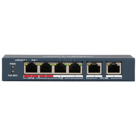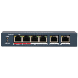 DDS-3E0106HP-E - 6-portowy przełącznik sieciowy, dedykowany do pracy w systemie monitoringu IP. Uniwersalny i niezawodny, umożliwia transmisję danych i realizację zasilania 4 dowolnych kamer IP PoE. Cechuje się on również wysoką funkcjonalnością i stabilnymi parametrami pracy ciągłej.