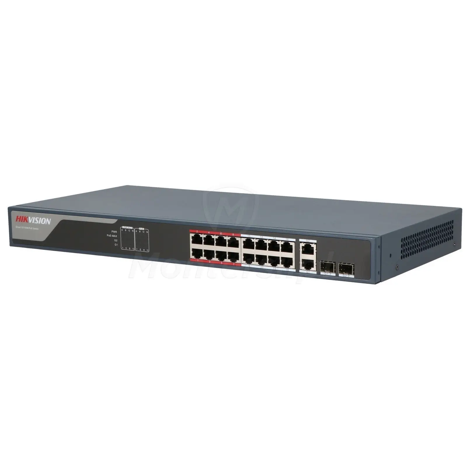 Model DS-3E1318P-EI(B) posiada wbudowane 16 portów PoE w standardzie 802.3af i 802.3at. Służą one zarówno do transmisji danych i zasilania podłączonych kamer PoE, po tym samym kablu UTP.