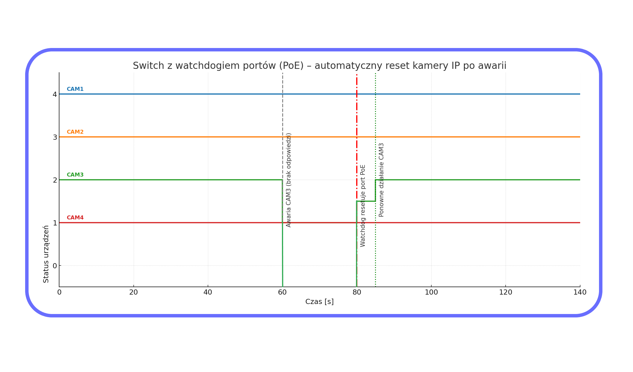 Automatyczna kontrola PoEFunkcja watchdog do restartu nieodpowiadających urządzeńSwitch monitoruje status podłączonych urządzeń PoE. W przypadku wykrycia braku odpowiedzi urządzenia, port PoE jest automatycznie wyłączany i ponownie włączany, co powoduje restart zasilania. Dzięki temu możliwe jest szybkie przywrócenie działania kamery bez konieczności ręcznej interwencji na miejscu, co szczególnie sprawdza się w rozległych lub trudno dostępnych instalacjach monitoringu. |