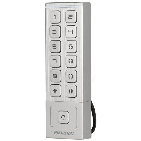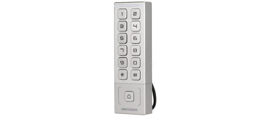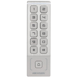 Model DS-K1T809MX to kompaktowy czytnik kart z klawiaturą fizyczną, przeznaczony do systemów kontroli dostępu. Urządzenie obsługuje identyfikację kartami M1 oraz kodami PIN i może być stosowane zarówno wewnątrz, jak i na zewnątrz obiektów. Dzięki odporności na warunki atmosferyczne (IP65) oraz prostemu montażowi, sprawdzi się w wielu zastosowaniach komercyjnych i przemysłowych