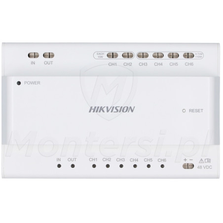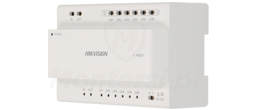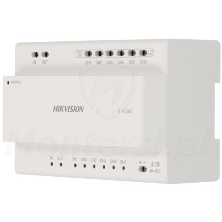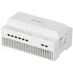 DS-KAD7060EY - Dystrybutor dla systemu 2-żyłowego Hikvision przystosowany do montażu na szynę DIN. Urządzenie umożliwia jednoczesne podłączenie i zasilanie urządzeń przeznaczonych do instalacji wideodomofonu takich jak monitory czy panele zewnętrzne za pomocą 2 żyłowej instalacji.