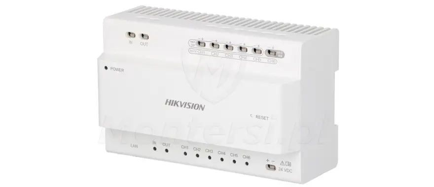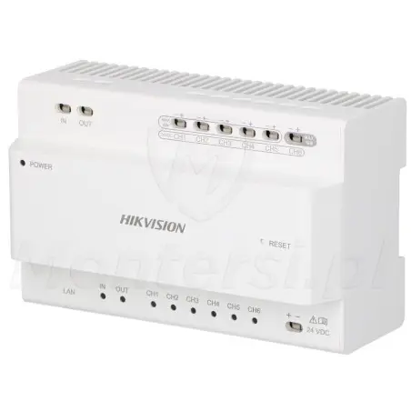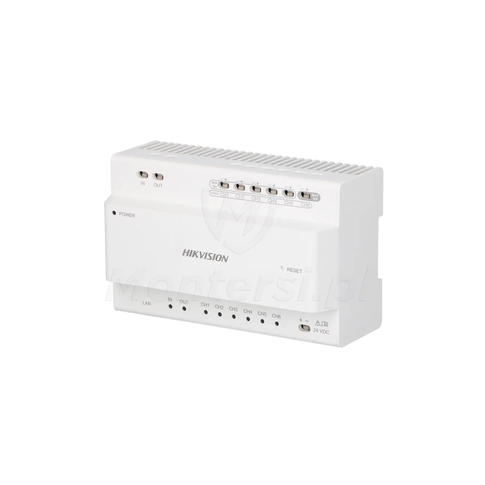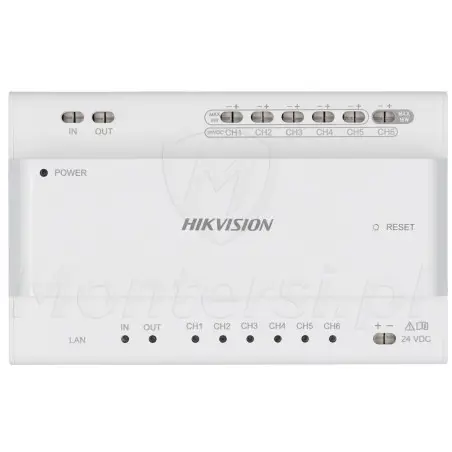 DS-KAD706Y - Switch zaprojektowany do tworzenia 2 - przewodowych systemów wideodomofonowych Hikvision. Pozwala na zasilenie oraz transmisje danych urządzeń. DS-KAD706Y posiada możliwość rozbudowy systemu o DS-KAD706Y-S