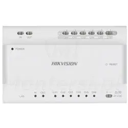 Centralnym urządzeniem komunikacji modułów w systemie wideodomofonów Hikvision jest właśnie DS-KAD706. Transmituje on sygnał audio / video oraz zasilanie do poszczególnych urządzeń. Switch podpięty do sieci LAN umożliwi nam na sterowanie systemu za pomocą aplikacji mobilnej HIK-connect oraz dostęp do podglądu z kamer IP.