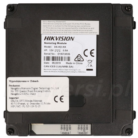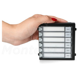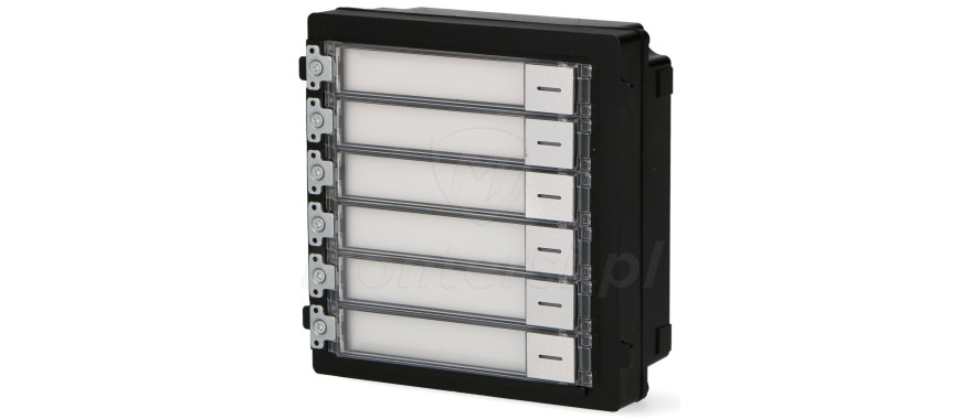 DS-KD-KK - To moduł wizytownika przeznaczony do pracy z systemem wideodomofonu HikVision. Moduł pozwala rozszerzyć listę lokatorów o kolejne 6 pozycji. Moduł wyposażony jest w sześć miejsc na wizytówkę użytkownika oraz przycisk wywołania do każdej wizytówki. Każdy z przycisków umożliwia wywołanie konkretnego abonenta i prowadzenie z nim rozmowy. Obudowa modułu została wykonana z wysokiej jakości materiałów i jest odporna na warunki atmosferyczne - Klasa szczelności IP65.