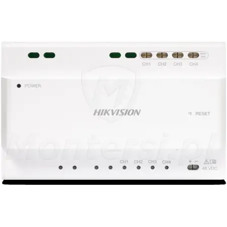 Dystrybutor DS-KAD7040EYElement systemu 2-żyłowego w zestawie KIS, umożliwiający jednoczesną transmisję zasilania (48 V DC) i sygnału sieciowego. Posiada 4 złącza 2-żyłowe (CH1–CH4 dla stacji bramowych / monitorów oraz IN/OUT do kolejnych modułów), 4 wskaźniki statusu, 1 wskaźnik zasilania oraz przycisk reset. Montaż na szynie DIN. |
