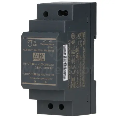 Zasilacz HDR 30-48Kompaktowy zasilacz impulsowy montowany na szynie DIN, dostarczający stabilne napięcie 48 V DC przy mocy 30 W i prądzie do 0,75 A. Zasilany z sieci 230 V AC, wyposażony w diodę LED sygnalizującą pracę oraz zabezpieczenia przed zwarciem, przeciążeniem i przepięciem. Dzięki wąskiej obudowie (35 mm) i montażowi na szynie DIN. |