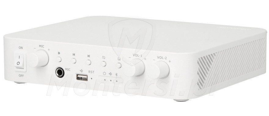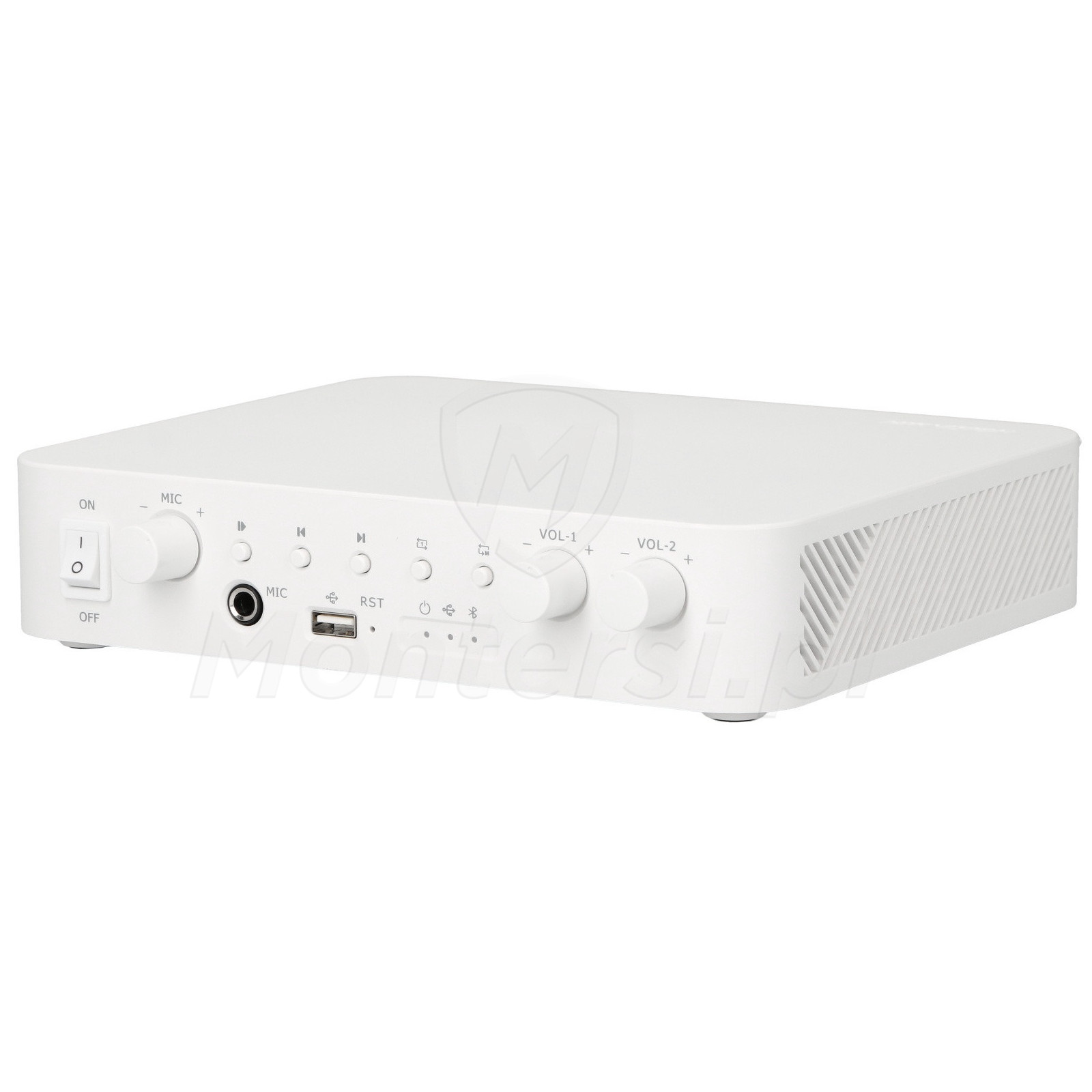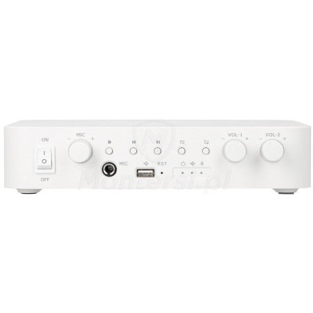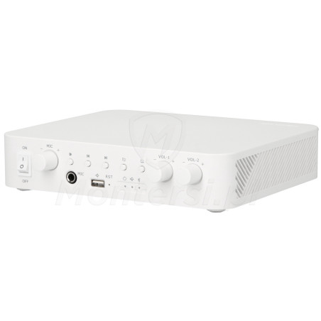 Dzięki funkcji Bluetooth możemy zdalnie podłączyć wzmacniacz z komputerem lub telefonem i cieszyć się wybraną muzyką bez przeszkód. Również dzięki tej funkcji uzyskujemy możliwość odtwarzania wcześniej przygotowanych komunikatów prosto z komputera. Dodatkowo wzmacniacz pozwala na podłączenie urządzenia USB i odtwarzanie muzyki bezpośrednio z niego.