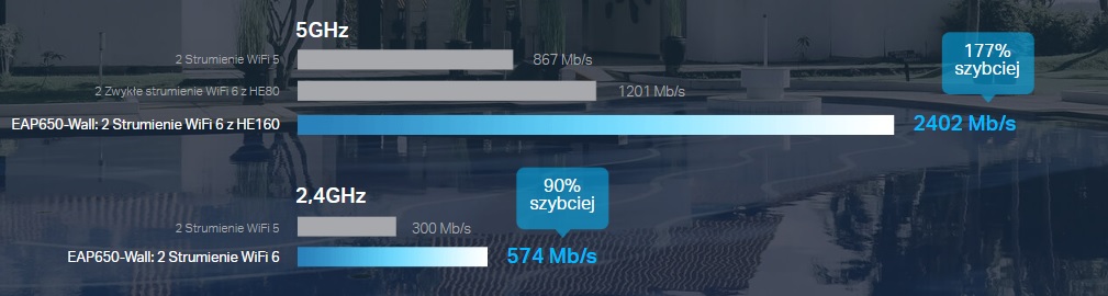 Access Point pracuje jednocześnie w paśmie częstotliwości 2.4 GHz i paśmie 5 GHz. Pasmo 5 GHz cechuje się wysoką przepustowością połączenia bezprzewodowego, wynoszącą aż 2402 Mb/s dla standardu 5 GHz oraz 574 Mb/s dla pasma 2.4 GHz. Access Point oferuje również rozwiązania umożliwiające zwiększenie bezpieczeństwa sieci takie jak: