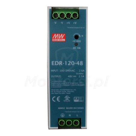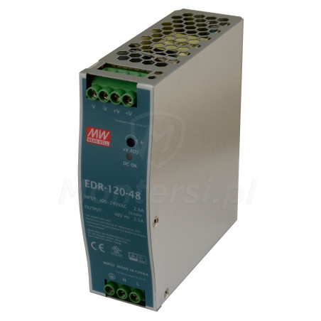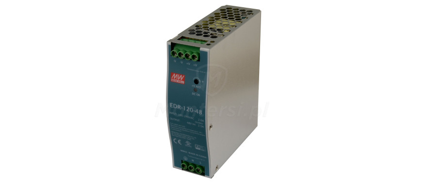 EDR-120-48 - Zasilacz na szynę DIN, dedykowany do współpracy z urządzeniami elektrycznymi 48 V DC, których maksymalny pobór prądu nie przekracza 2.5 A. Do jego elementów wyróżniających można zaliczyć: